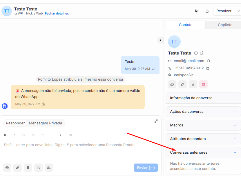 Com a conversa aberta, acesse o menu lateral direito e veja o campo "Conversas anteriores"